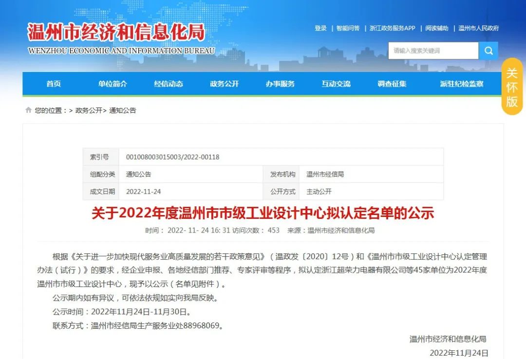 近日,长城电器集团浙江科技有限公司荣获“2022年度温州市市级工业设计中心"、“温州市2022年第二批市级高新技术企业研究开发中心"两项殊荣。