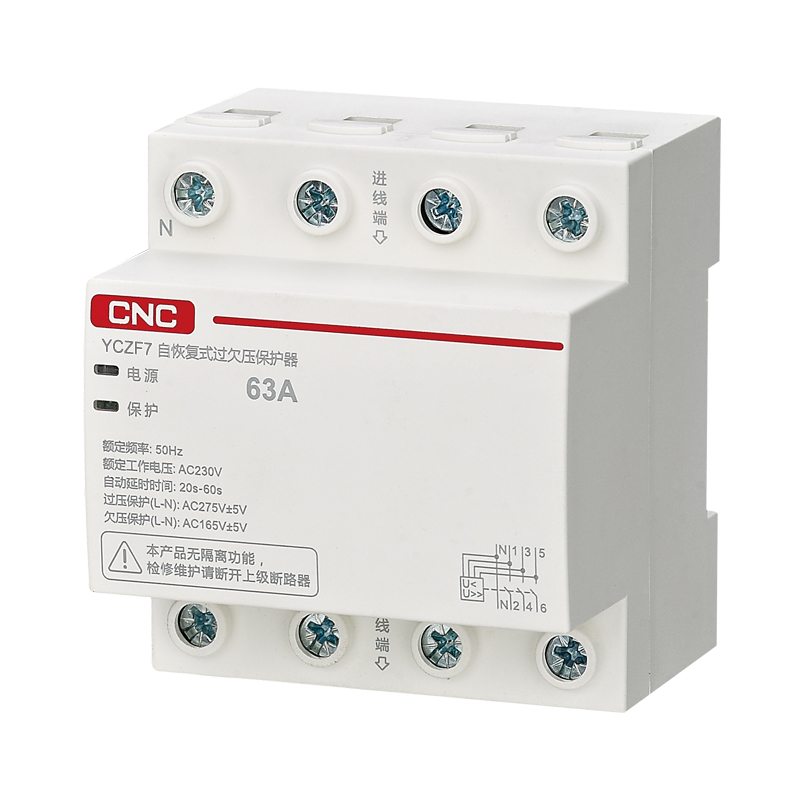 YCZF7自恢复式过欠压保护器适用于交流电压230V/400V,频率50Hz,额定工作电流100A及以下的用户或负载。主要用于住宅分户箱或其他需要保护的配电线路中。
